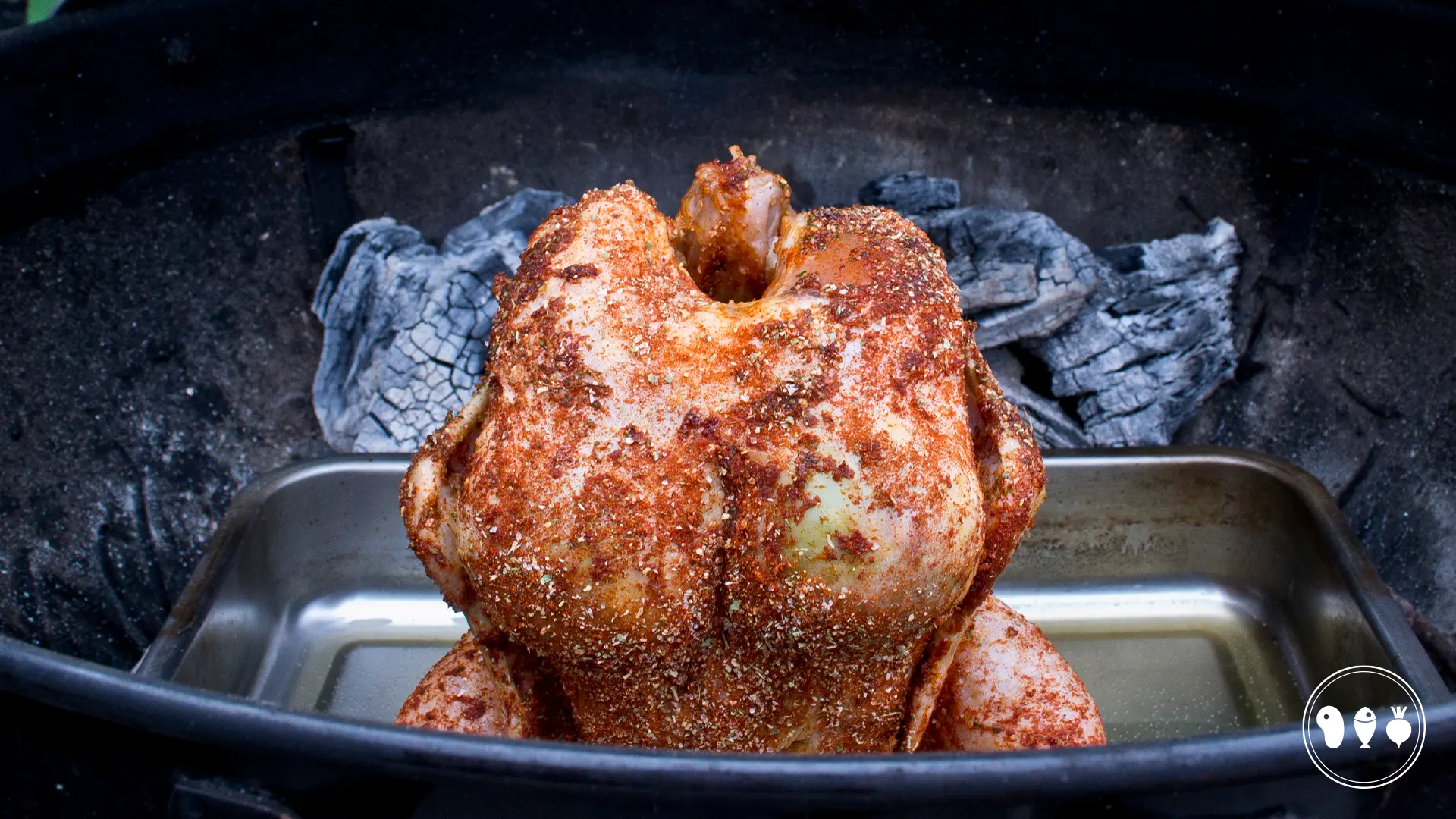Stop nu een kerntemperatuurmeter in de dij van de kip en een blokje rookhout tussen de warme kolen. Sluit de deksel en neem nog een lekker pilsje. Je hoeft nu namelijk alleen nog maar te wachten.