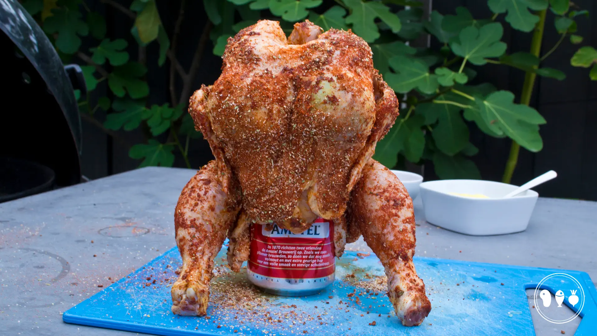 Strooi hierna nog wat extra kruiden over de borst. Neem een flinke slok (of een paar) bier en zet de kip op het blik. Je kan ook wat bier in de lekbak gieten.
