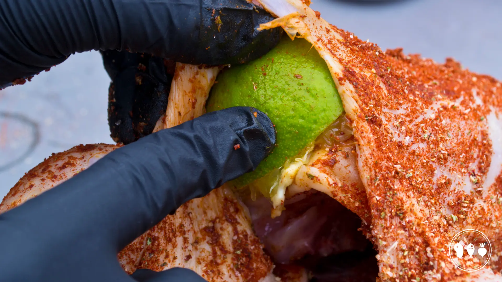 Bereid je BBQ voor om indirect te grillen op ongeveer 170 graden. Plaats een lekbak in je BBQ en zet hier de kip in met de rug (dus niet de limoenkant) richting de kolen. Hiermee voorkom je dat de borst sneller klaar is dan het dijvlees (die een hogere kerntemperatuur nodig heeft).