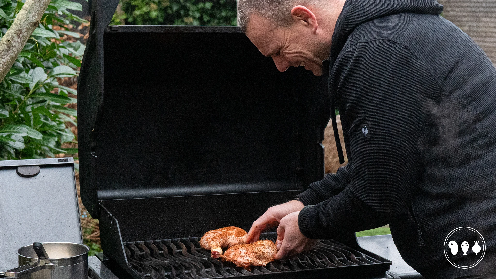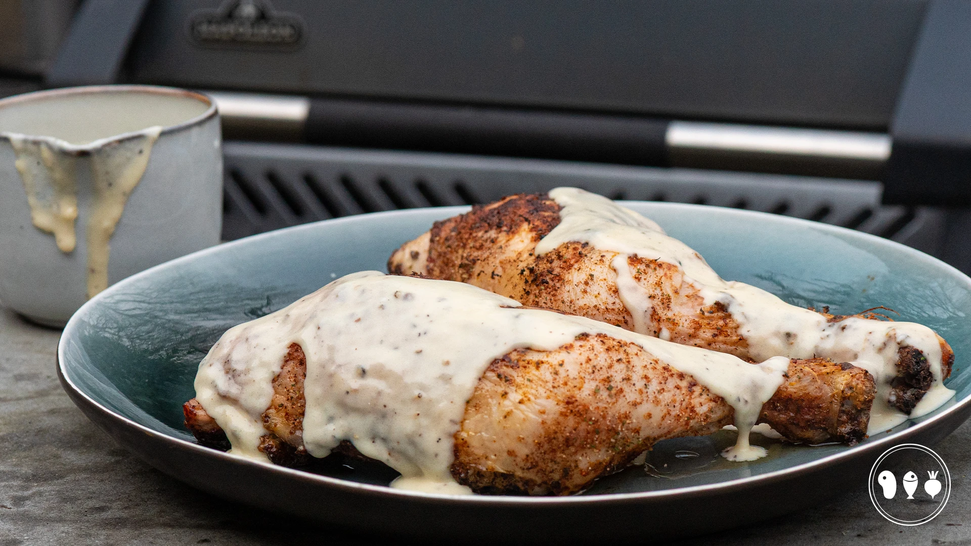 Het fijne van een kippenbout is dat het wat vetter vlees is dan de borst. Logisch ook, want het is de hele poot van de kip, inclusief de dijfilet en drumstick. Dus deze kan ook wel tegen een stootje, perfect dus om te bereiden op de BBQ. De kippenbouten gaat we op een redelijk hoge temperatuur indirect bereiden, zodat we een krokant velletje krijgen. Ondertussen hebben we dan de tijd om de saus te maken, en die is echt heel eenvoudig. Eerst maken we een roux voor de structuur (boter en bloem) en daarna voegen we langzaam de overige ingredienten toe. De room voor het romige geheel, wat bouillon, witte wijn voor klein zuurtje en extre diepte in de smaak en als laatste de kaas!