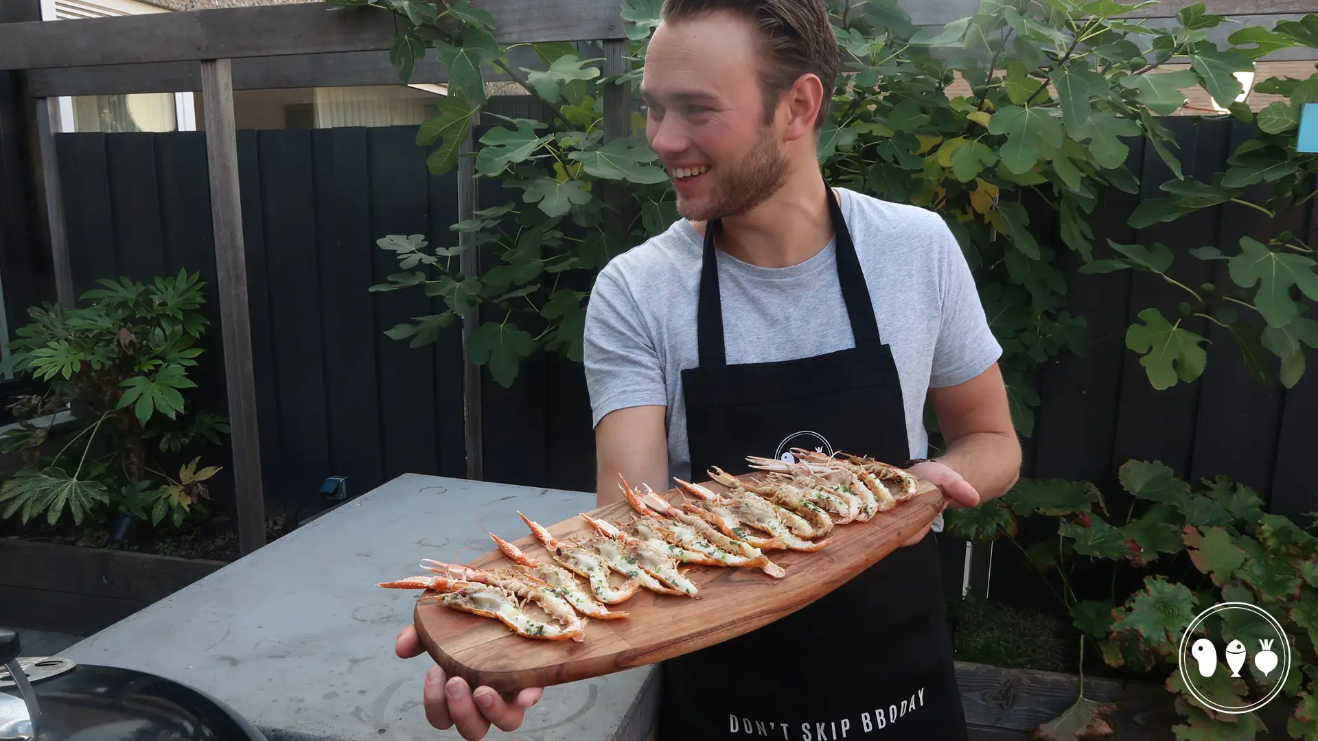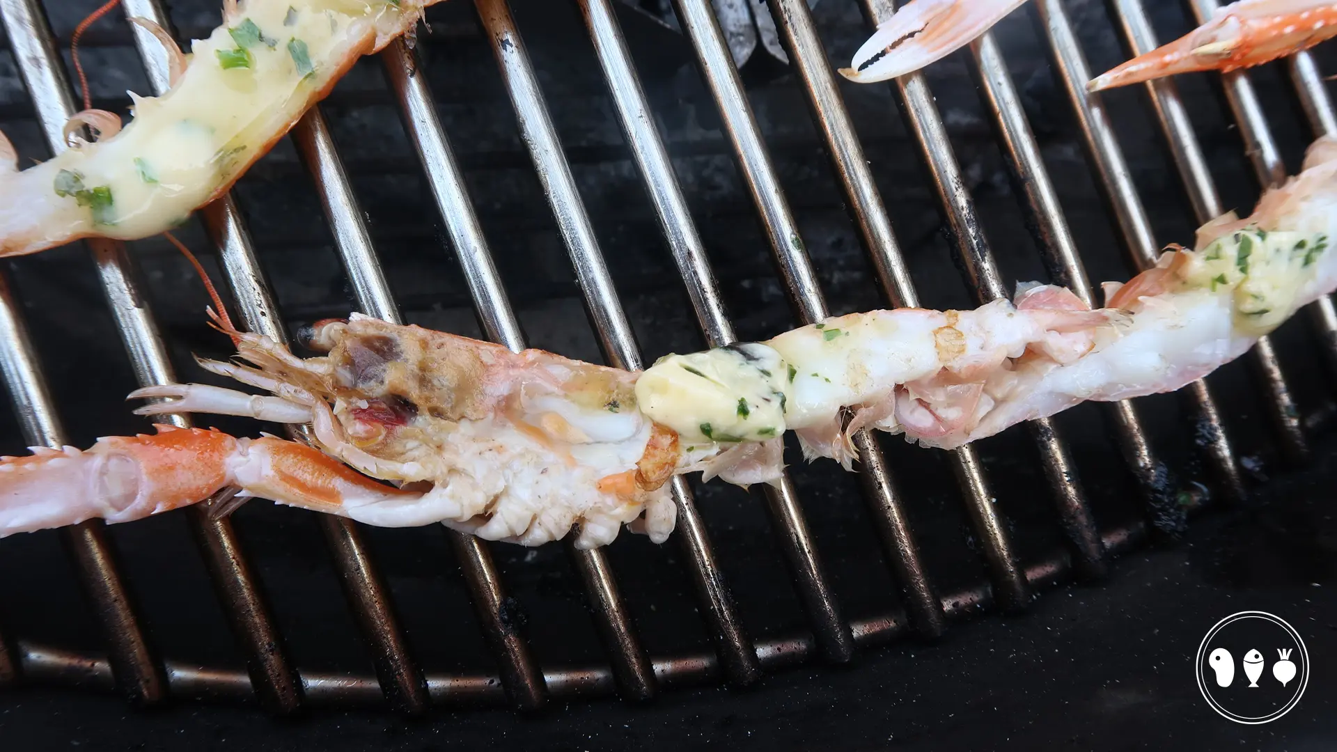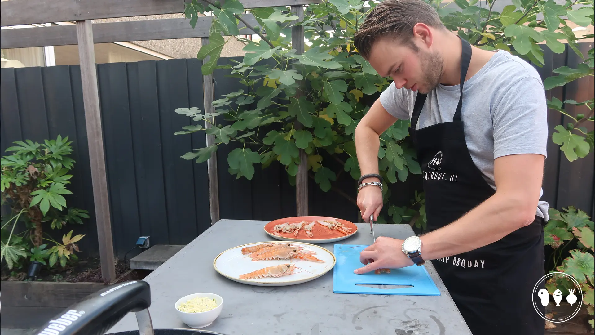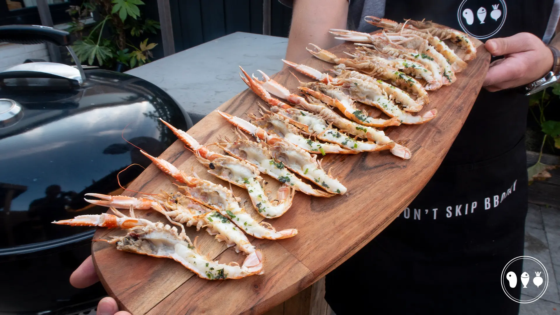 De langoustines gaan we super kort grillen. Wanneer je ze te lang op de barbecue hebt worden ze droog en dat wil je niet! Wij hebben de langoustines in tweeën gesplitst, kort op de schaal gegrild en daarna met wat kruidenboter nog even langzaam indirect laten garen. Subliem! Het voordeel van het grillen in de schil is dat de schil ook erg heet wordt en dus het vlees direct verwarmd. Het vlees laat daarom ook makkelijk los!