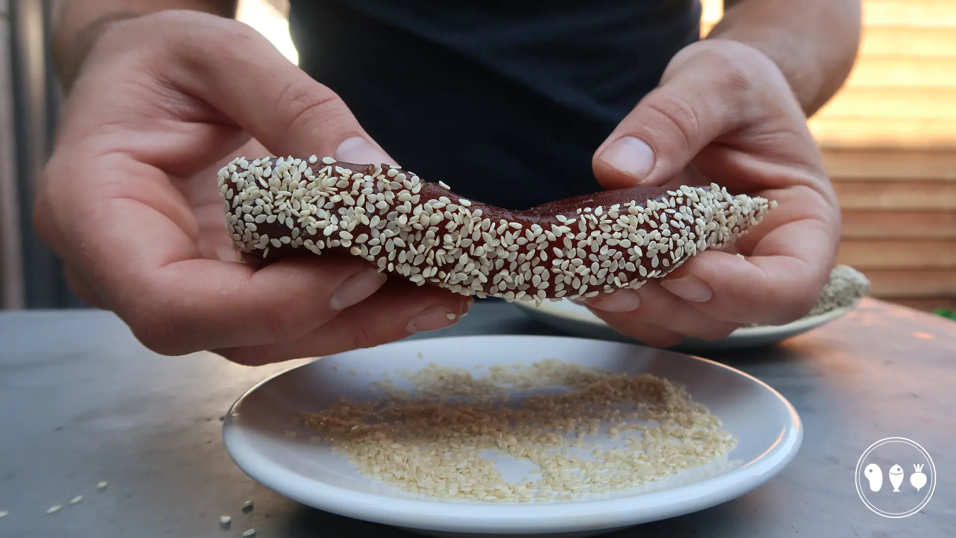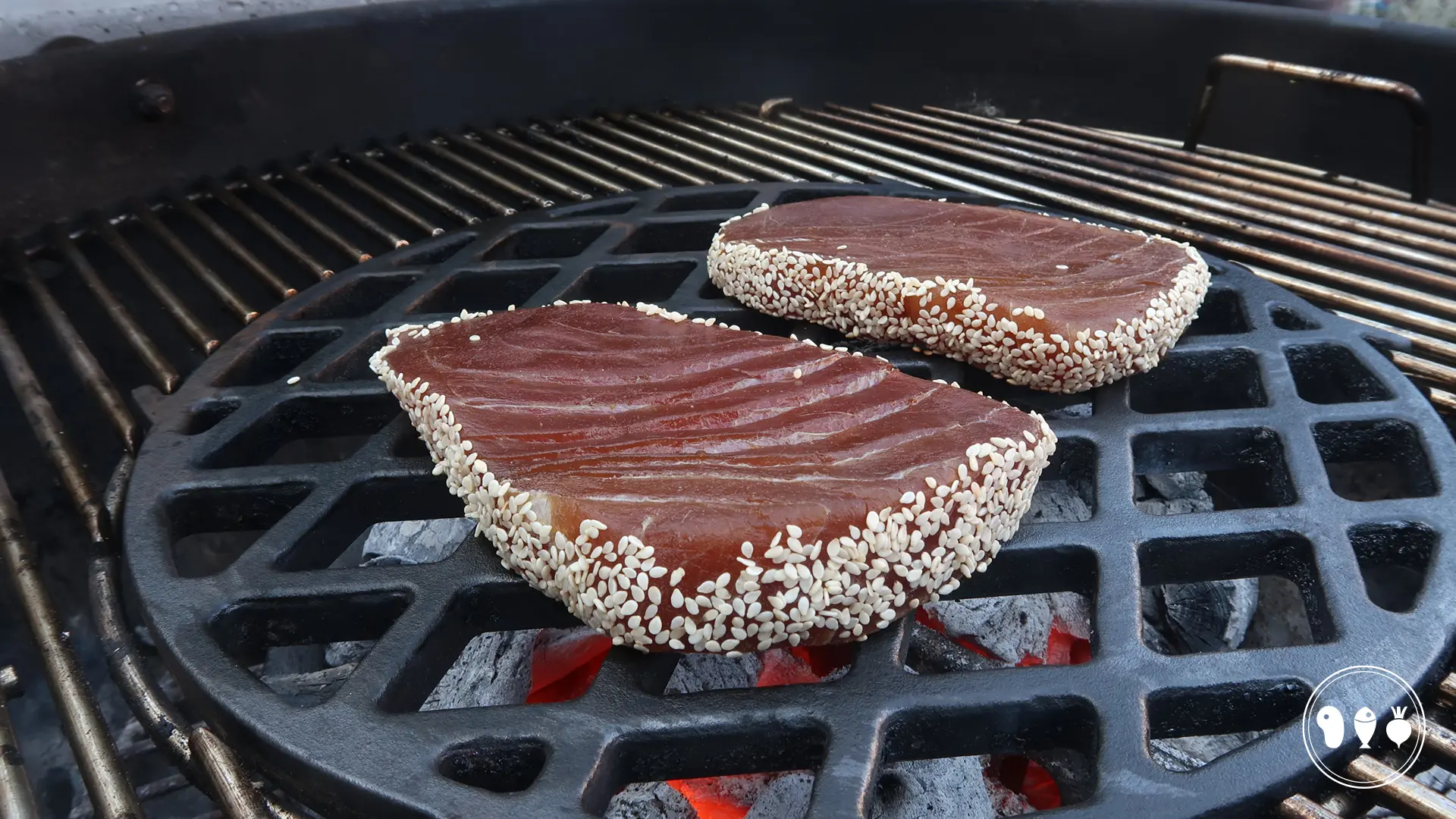 Omdat Bastiaan en ik ook erg fan zijn sushi wilden we die smaken terug laten komen in dit gerecht. We hebben de tonijn daarom even kort gemarineerd in sojasaus en vervolgens door de sesamzaadjes gehaald. Je krijgt hierdoor een krokant randje om je tonijnsteak. Heerlijk! Bij de tonijn serveren we een pittige wasabimayonaise. Alleen al tijdens het bedenken van dit recept liep het water ons al in de mond. Dus op naar de visboer en steek aan die BBQ!