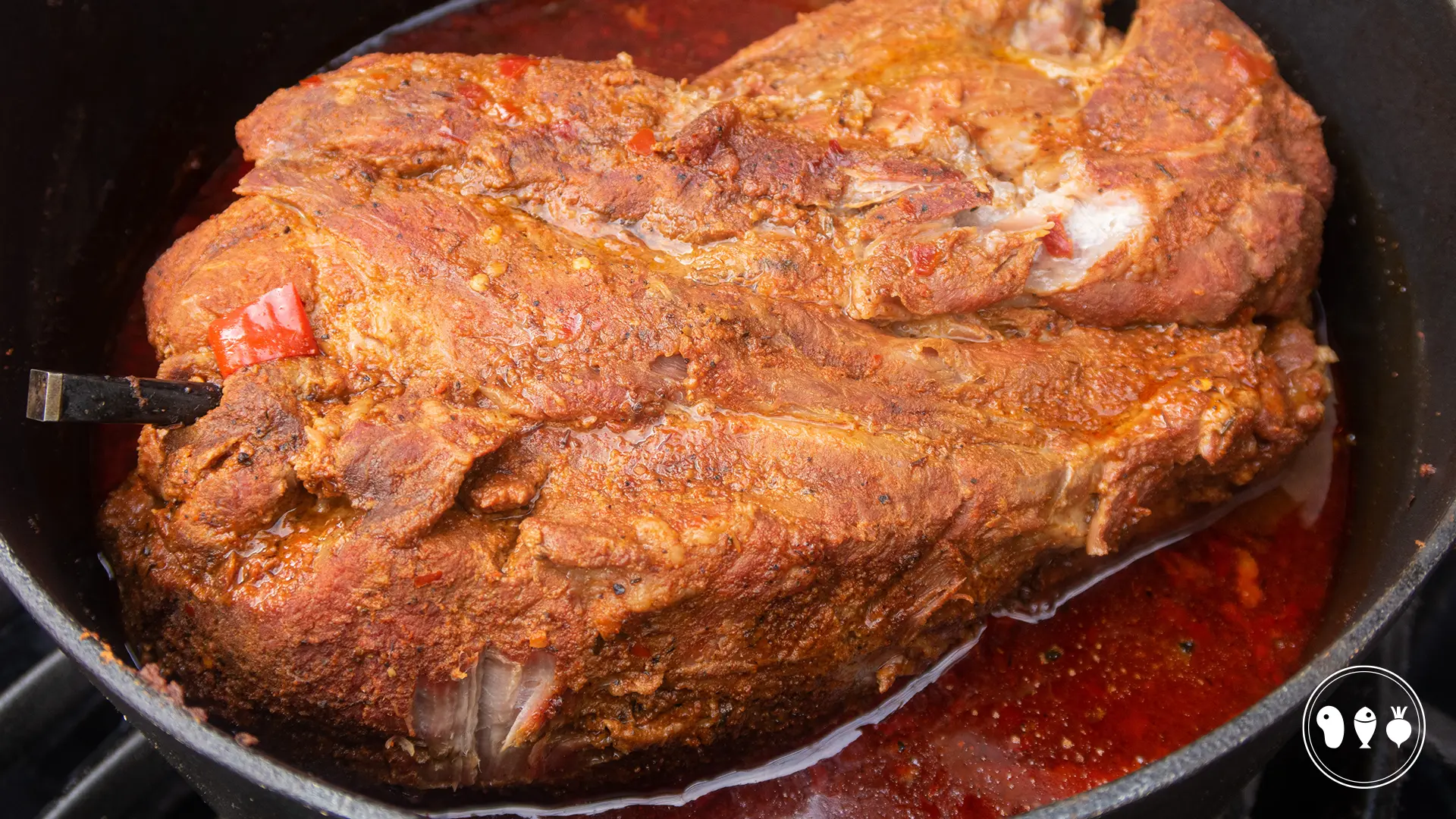 De Dutch oven is de perfecte manier om gerechten in te stoven, het gietijzer geleid goed en de pan houd de warmte goed vast. Je kan de DO gebruiken boven een vuurtje of in de BBQ. Voor dit recept gebruiken we de Dutch oven in onze gas BBQ. Hierdoor kunnen we de temperatuur van de DO veel beter controleren en kunnen we de temperatuur makkelijk op 80-90°C houden. Dat is de temperatuur dat het bindweefsel in het vlees(collageen) op begint te lossen. Ga je op een hoge temperatuur garen en dus koken, dan verlies je teveel vocht en wordt het taai en droog.