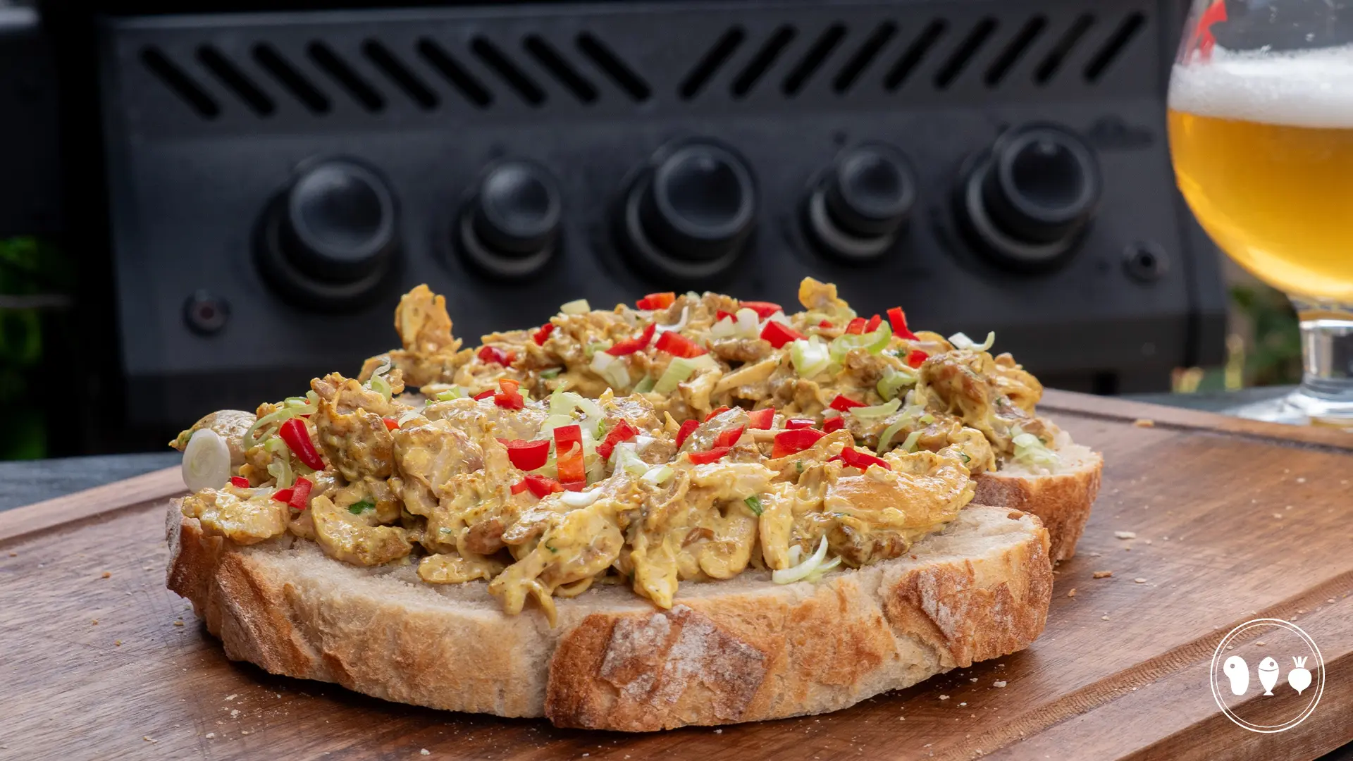 De kans is aan een broodje bij de benzinepomp of aan een feestje bij familie. Ondanks dat er niets Nederlands aan kerrie is, is de kipkerrie salade een klassieker in de Nederlandse keuken. Kijk maar is in de supermarkt hoeveel merken er te koop zijn. Zelf ben ik ook echt fan, het liefst met een beetje pit erin. Maar hoe maak je nou kipkerriesalade? Het is dus super simpel. In dit recept laten wij zien hoe je zelf eenvoudig kipkerrie salade kan maken. Uiteraard maken wij dit recept op de BBQ maar je kan eventueel (geen idee waarom?!) het ook in de oven bereiden. Let op, na het lezen van dit recept, haal jij nooit meer kipkerrie in de supermarkt. Want met dit kipkerrie sandwich recept gaat er een wereld voor je open.