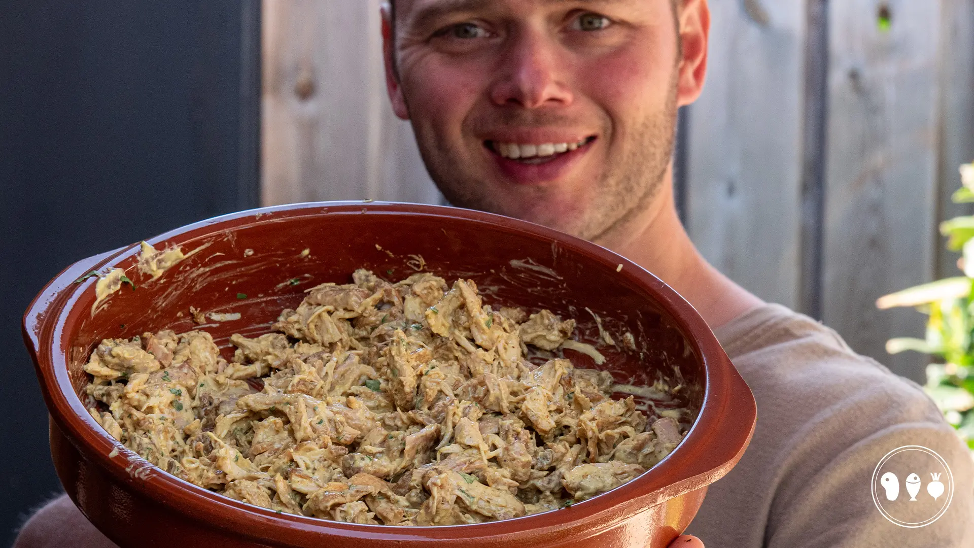 Wat deze kipkerrie sandwich zo bijzonder maakt, is de combinatie van barbecue-rooksmaak met de vertrouwde romige kerriesmaak. De pulled chicken is sappig en zacht, terwijl de saus zorgt voor balans tussen kruidig, fris en licht zurig. Een vleugje rook maakt het net wat dieper en spannender dan een standaard kipkerriesalade. De sandwich fleuren we nog wat op met bosui en peterselie. Zoooo lekker.