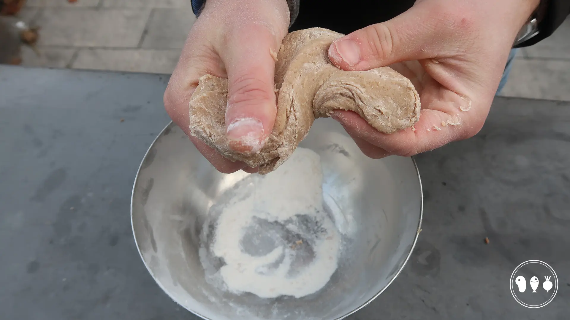 Voeg de melk en boter toe aan het mengsel en kneed er een samenhangend deeg van. Wij hebben het deeg in tweeën verdeeld en hebben aan één deeg nog 1 grote theelepel cacao toegevoegd. Als je dit doet, meng het deeg dan nog even goed door.
