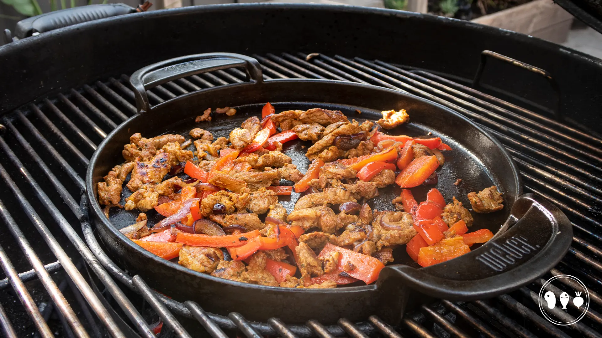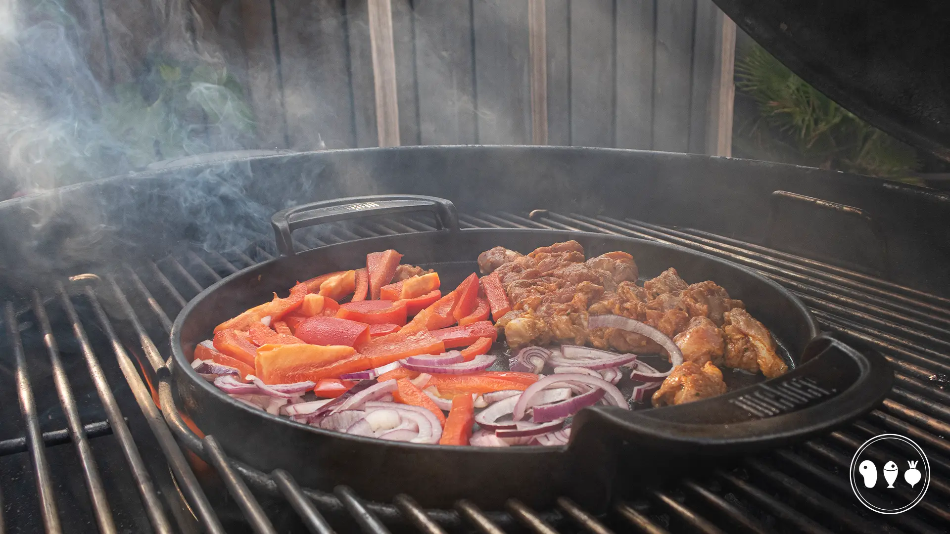 De makkelijkste oplossing is dan het gebruik van een bakplaat/skillet. Op deze bakplaten kan je perfect grillen zonder risico dat de stukjes vlees tussen je kolen verdwijnen. Top dus! Wij hebben nog wat ui en paprika mee gebakken, deze groenten passen perfect bij shoarma. En voor de echte BBQ beleving hebben we nog wat rooksnippers op de kolen gegooid. Dit rookt heel kort maar geeft toch net even die extra BBQ touch mee aan de shoarma. Heerlijk!