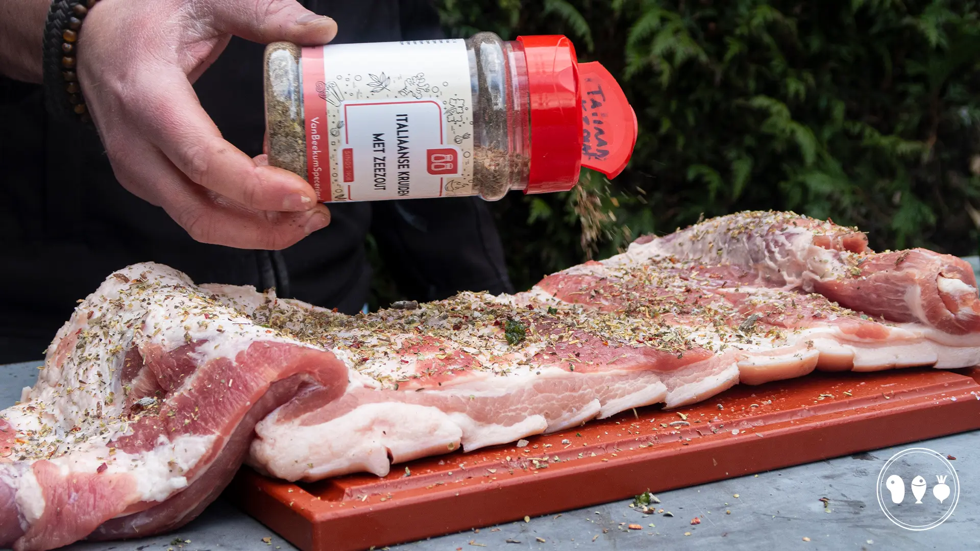 Wat wij wel gelijk hebben gehouden aan de originele bereiding is het gebruik van het spit. Door het spit wordt de porchetta overal evenredig gegaard. Dit versnelt de bereidingstijd maar zorgt dus ook dat de zwoerd echt op alle plekken lekker crispy wordt, en dat is natuurlijk precies wat je wilt. Heb je nou geen spit, geen probleem, je bent alleen iets drukker omdat je de rollade telkens moet draaien om hetzelfde knapperige resultaat te krijgen. De porchetta is dus een Italiaanse varkensrollade. Hij staat bekend om de mooie tekening van de verse kruiden in de binnenkant van het vlees. Dit krijg je door de buikspek te vlinderen. Daarmee maak je het vlees overal even dik en heb je op alle plekken evenveel kruiden. Hetzelfde hebben wij al eerder laten zien bij onze andere rollade's: zalmrollade en bavette rollade.