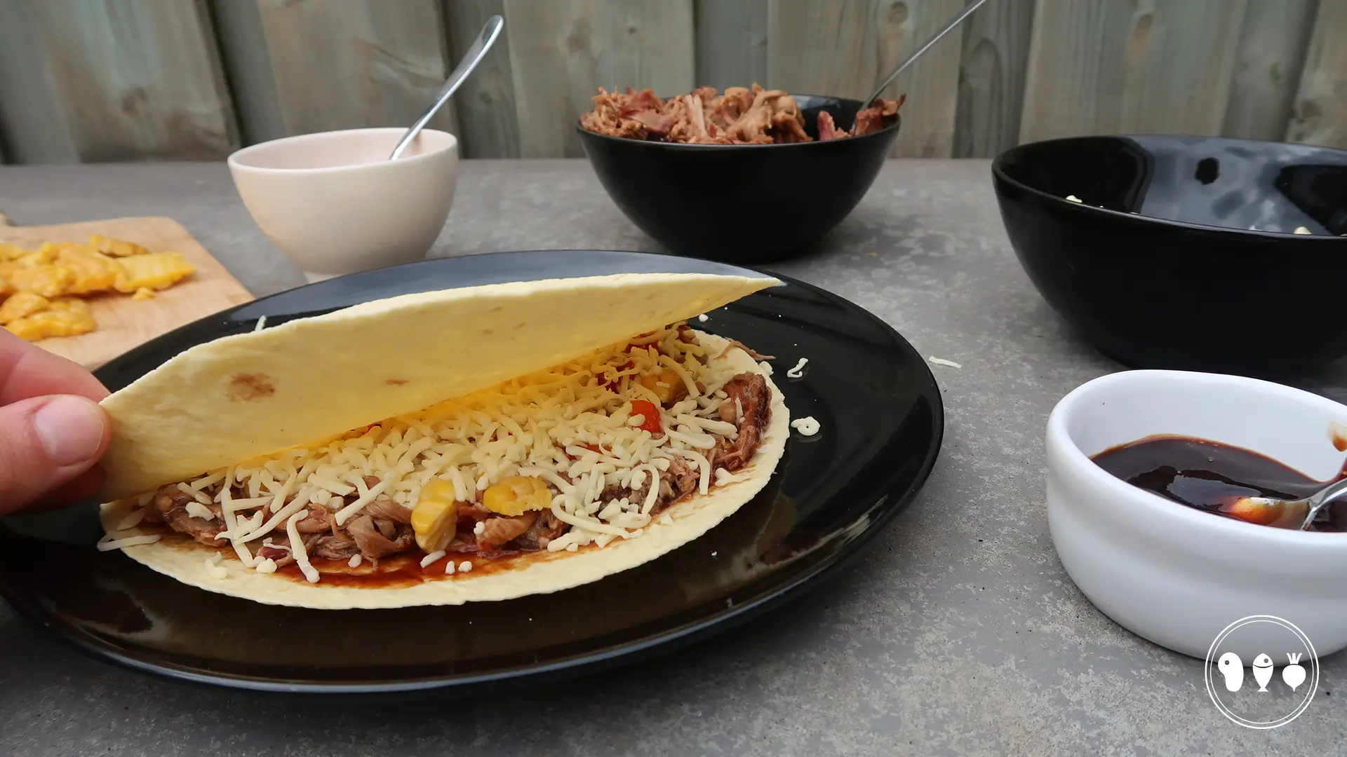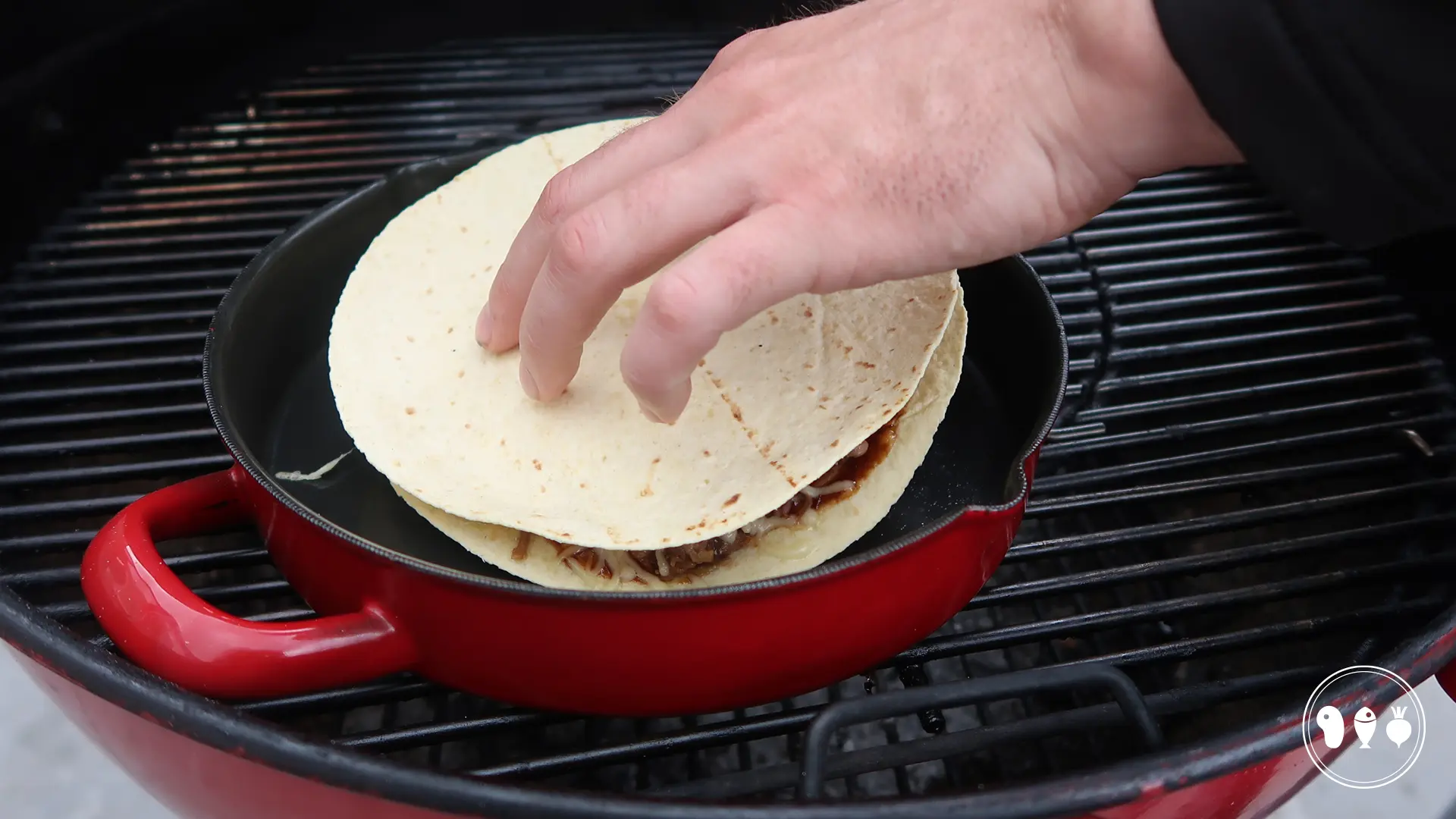 Een quesadilla is eigenlijk een soort Mexicaanse tosti. Kaas kan dus ook niet ontbreken in dit gerecht. Wij hebben voor geraspte belegen kaas gekozen omdat we dit nou eenmaal in huis hadden. Als je liever jonge of een andere kaas wilt is dat dan ook geen probleem. Voor het maken van de quesadillas hebben we gebruik gemaakt van een metalen pannetje, een zogenaamde skillet. Deze plaatsen we op het rooster van de BBQ. Dit pannetje houdt alle ingrediënten mooi op hun plek zodat je niet bang hoeft te zijn dat deze door je rooster vallen. Beleg de tortilla met alle ingrediënten en je hebt binnen een paar minuten een heerlijke snack op tafel!