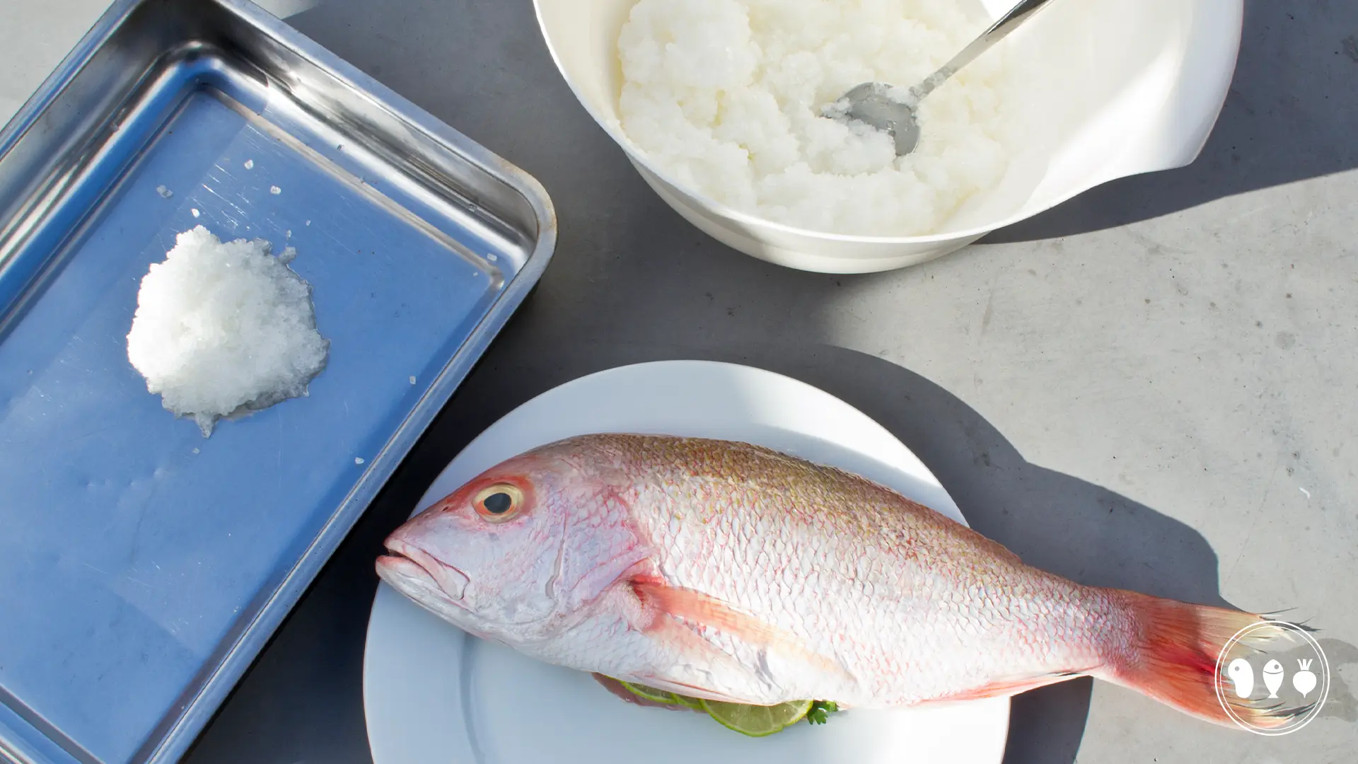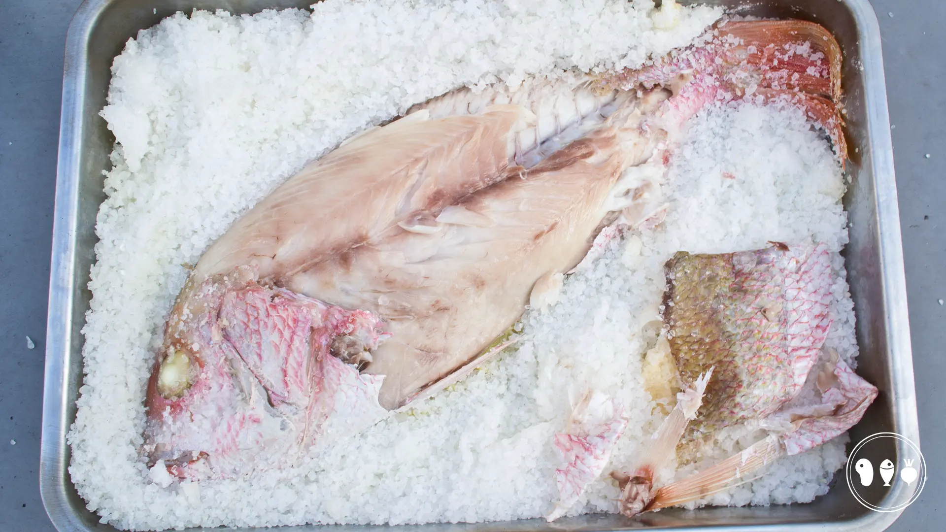 In eerste instantie zou je denken dat de vis erg zout wordt maar dat is dus niet het geval! Uiteraard moet je wel uitkijken met het weghalen van de zoutkorst maar als je een goede korst hebt trekt deze niet in de vis. Sommige recepten geven daarom ook aan dat je de schubben moet laten zitten, dat is bij dit recept niet nodig. Lekker schoon laten maken die vis! Het is ook belangrijk dat je de korst aanmaakt met eiwit en niet met water. Als je het zout aanmaakt met eiwit gaat deze mooi stollen en krijg je een harde korst. Wanneer je de korst aanmaakt met ei en water bindt deze minder goed en zal je vis ook zouter zijn. De zoutkorst wordt daarnaast ook minder hard. Het mooie aan deze bereiding is dat je door de zoutkorst een oven creëert. De vis wordt gelijkmatig gegaard binnen de zoutkorst en alle smaken kunnen niet ontsnappen. Je krijgt dus een super smaakvolle vis.