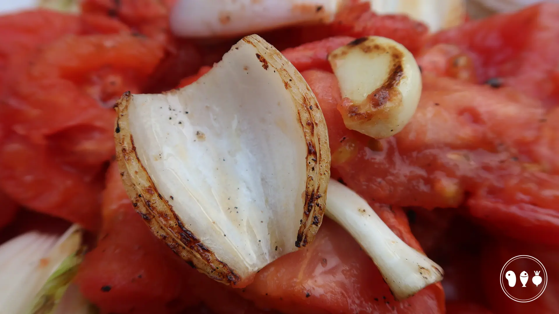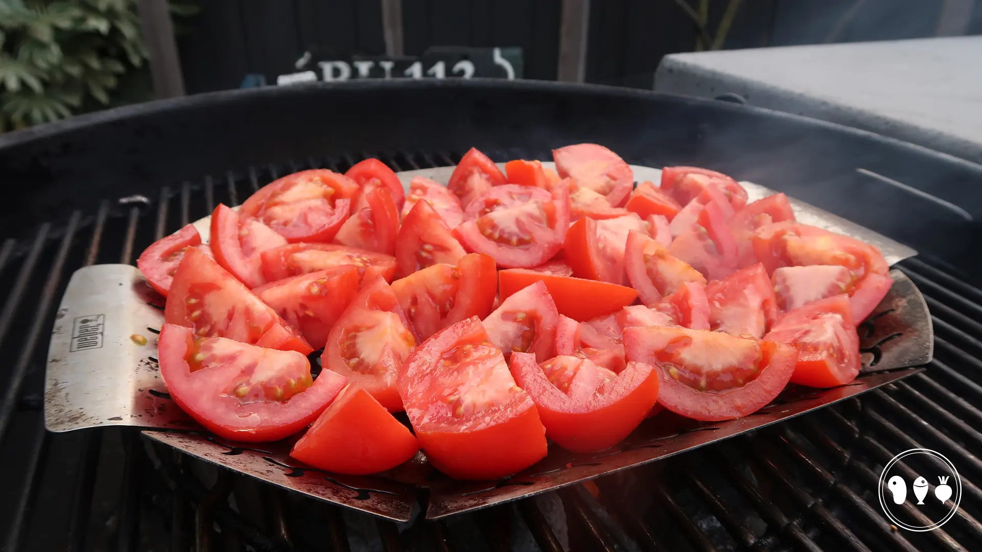 Leg eerst alle parten tomaat in de groentenkorf en gril deze boven de kolen. Let op dat er geen vlammen ontstaan anders komt er roet op je groente (door de olijfolie die lekt op de kolen). Sluit het deksel dus direct. De tomaten kan je ca. 5 minuten grillen, draai de tomaten tussendoor wel om. Houd wel de kleur in de gaten, je wilt niet dat ze zwart worden. Leg de gegrilde tomaten apart in een schaal. Nu gaan we de knoflook en ui grillen.