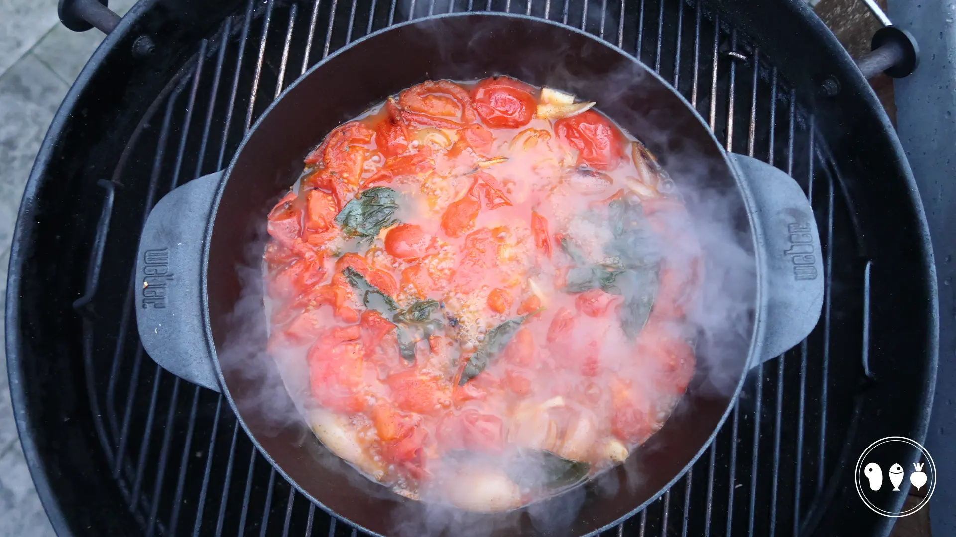 Als de pan warm is mogen alle ingrediënten de DO in. Begin met het water en de gegrilde groente. Daarna de kruiden, basilicum en als laatste verkruimelen we het groente bouillon blokje erboven. Meng vervolgens alles door elkaar, plaatst het deksel op de DO en het deksel op de barbecue.