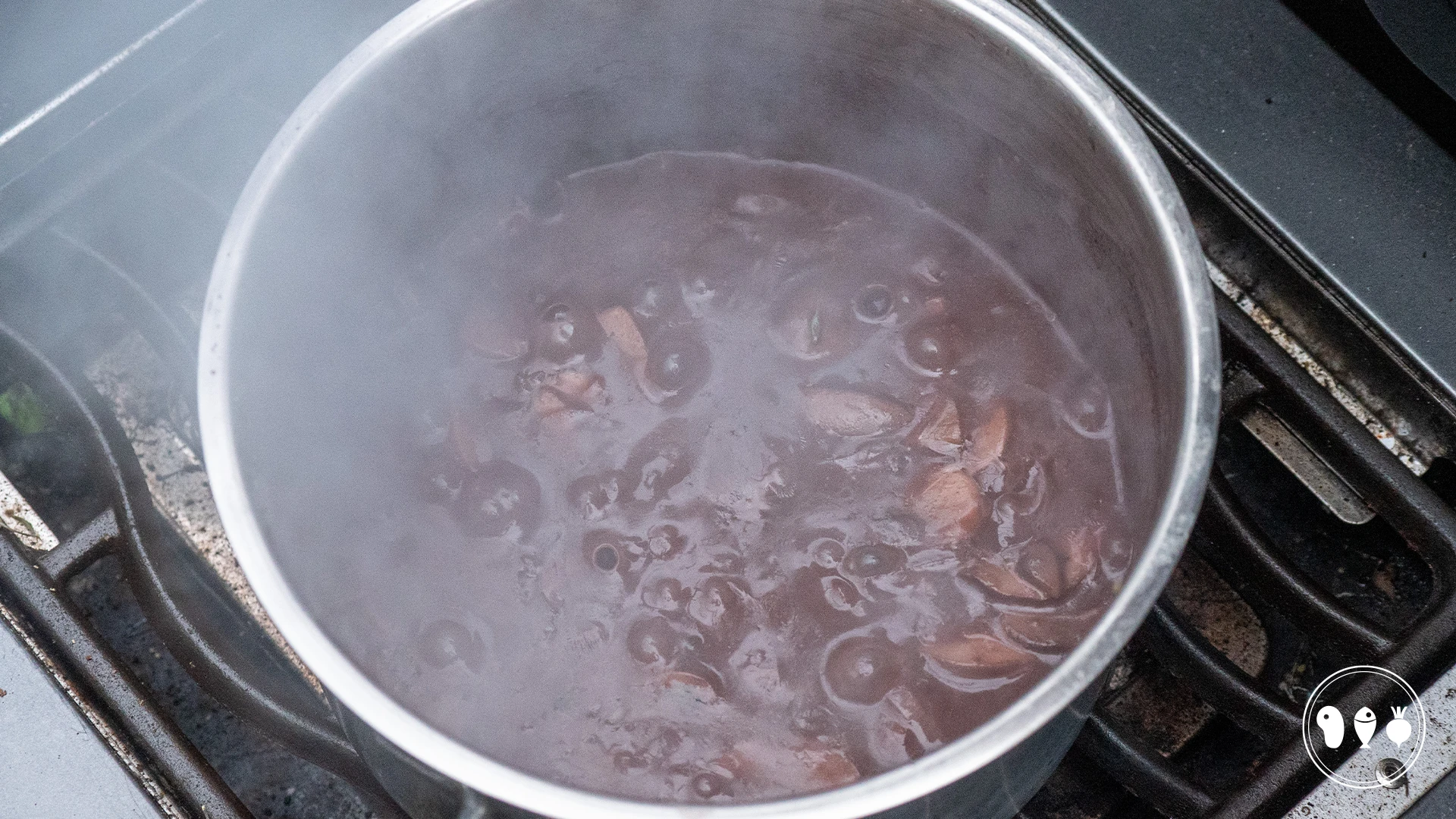 Allereerst gaan we de rode wijn inkoken, dit doen we zodat de bittere smaak van de wijn verdwijnt. De wijn mag zeker tot 1/3 inkoken. Zet daarna apart.