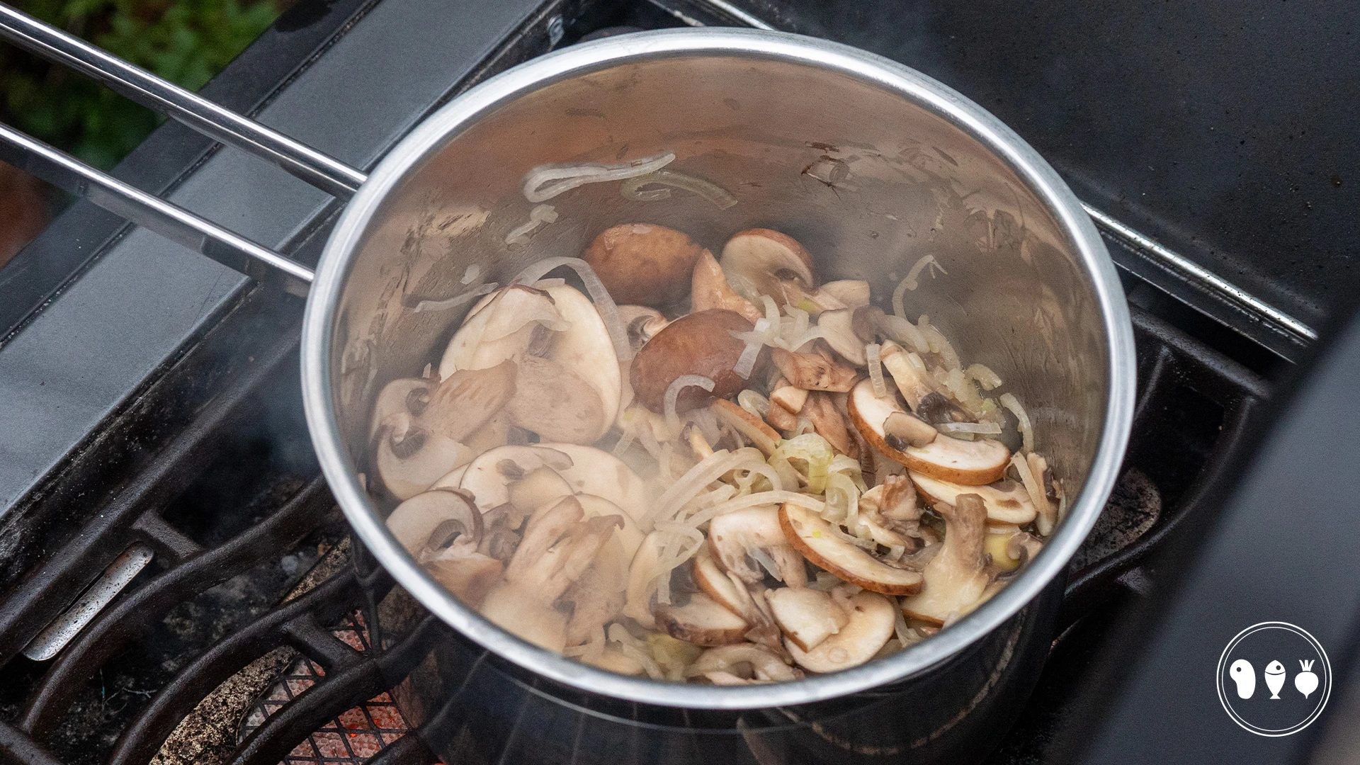 Zet een steelpannetje op middelhoog vuur en laat de roomboter hierin smelten. Als de boter gesmolten is, voeg je de sjalot, tijm en champignons toe. Bak dit even goed aan, tot de champignons goed geslonken zijn.