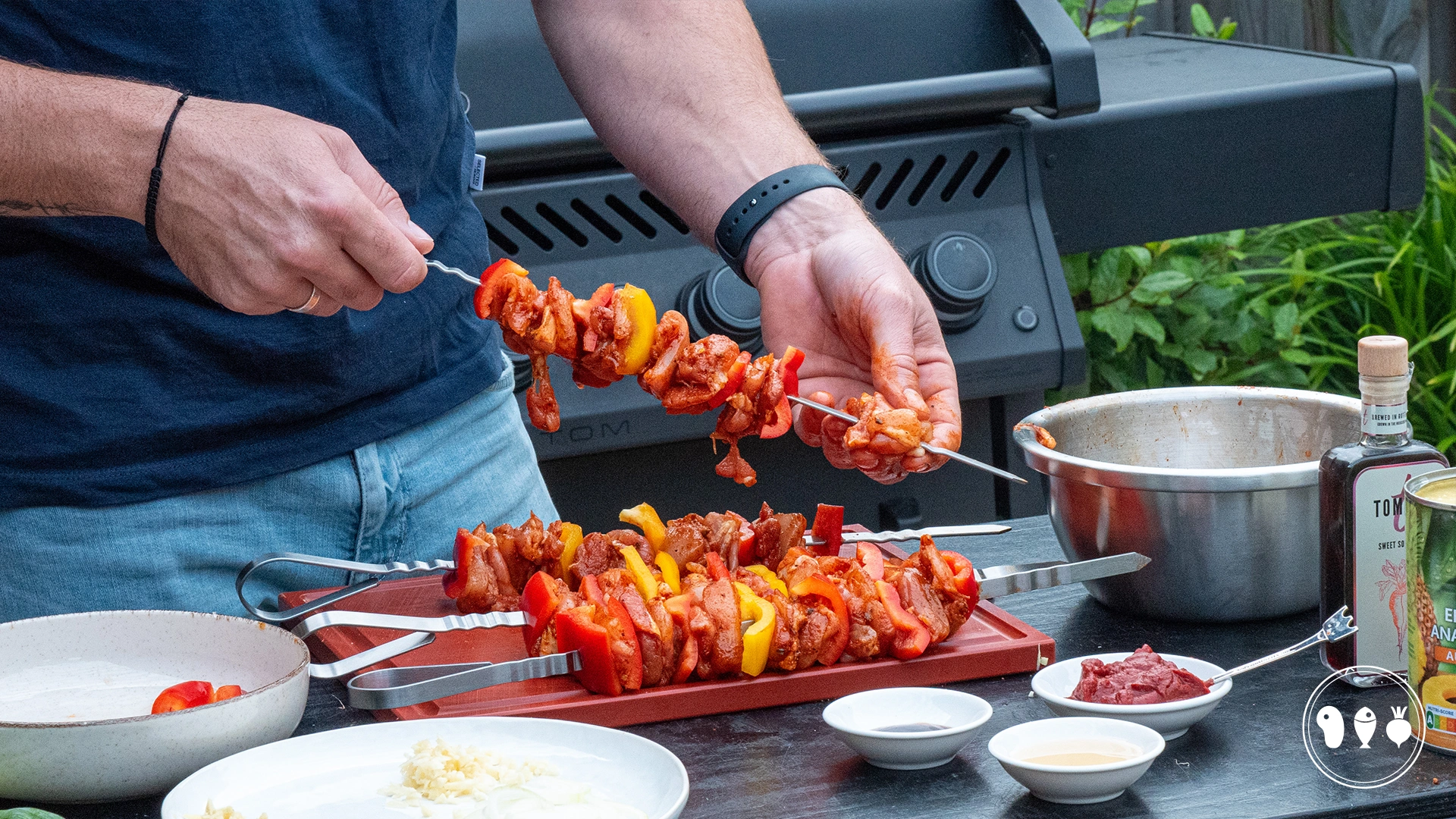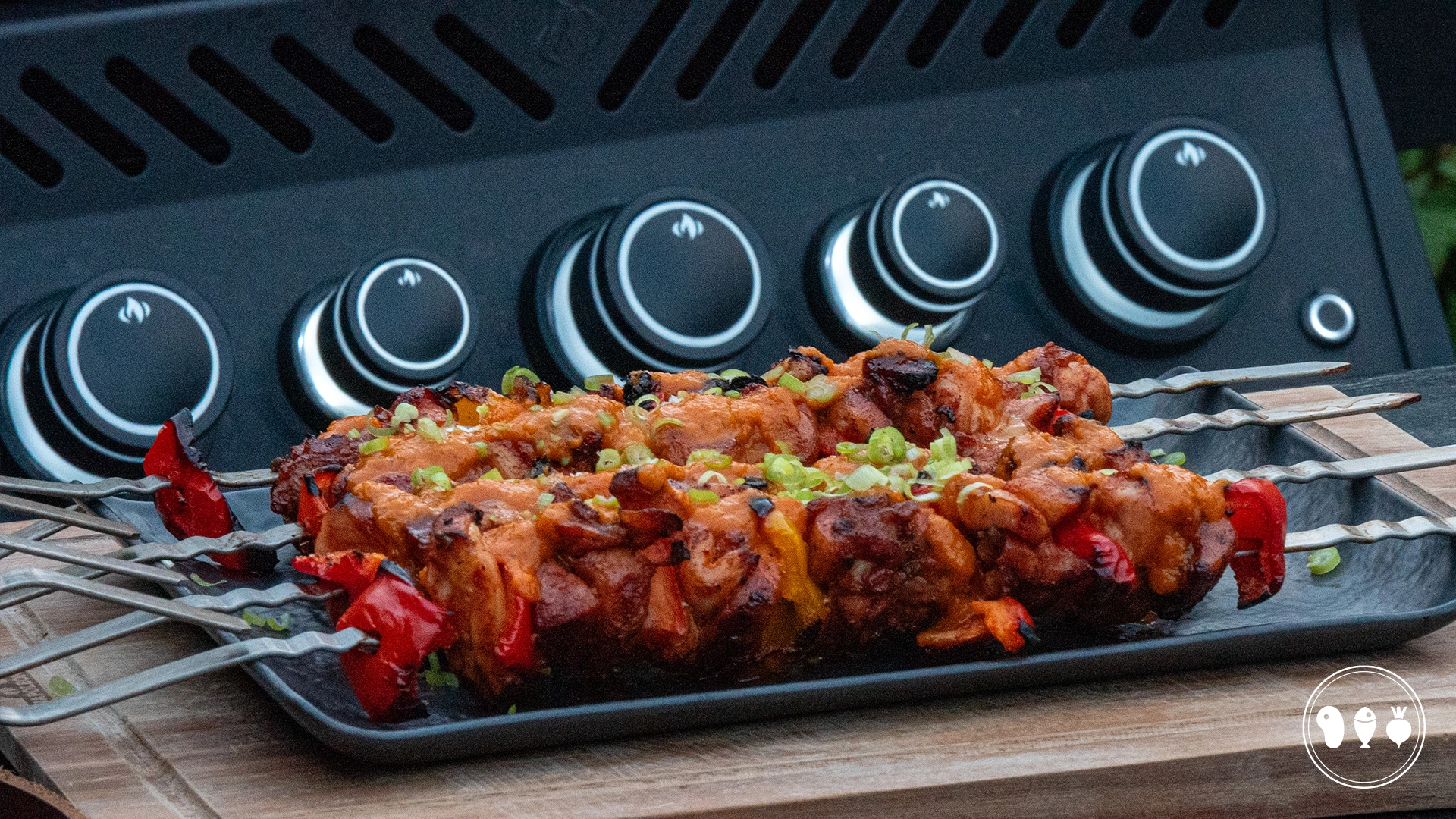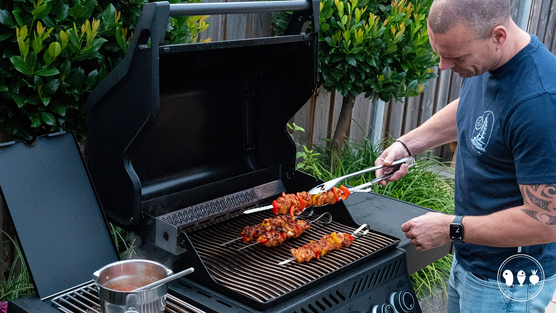 Wij hebben de spiezen dus bereid op de Phantom Rogue van Napoleon. Dit is een gas BBQ en hierdoor ben je erg flexibel met de temperatuur beheersing. Wij hebben er daarom voor gekozen om de spiezen direct te grillen op een lage temperatuur. Kipdij kan sowieso wel wat hebben en wij vinden het lekker als je een krokant korstje krijgt.